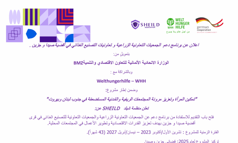بتمویل من الوزارة الاتحادیة الألمانیة للتعاون الاقتصادي والتنمیةBMZ وبالشراكة معWHH – Welthungerhilfe ، تعلن منظمة شيلد Sheild عن فتح باب التقدیم للاستفادة من برنامج دعم عن الجمعیات التعاونیة الزراعیة والجمعیات التعاونیة للتصنیع الغذائي في