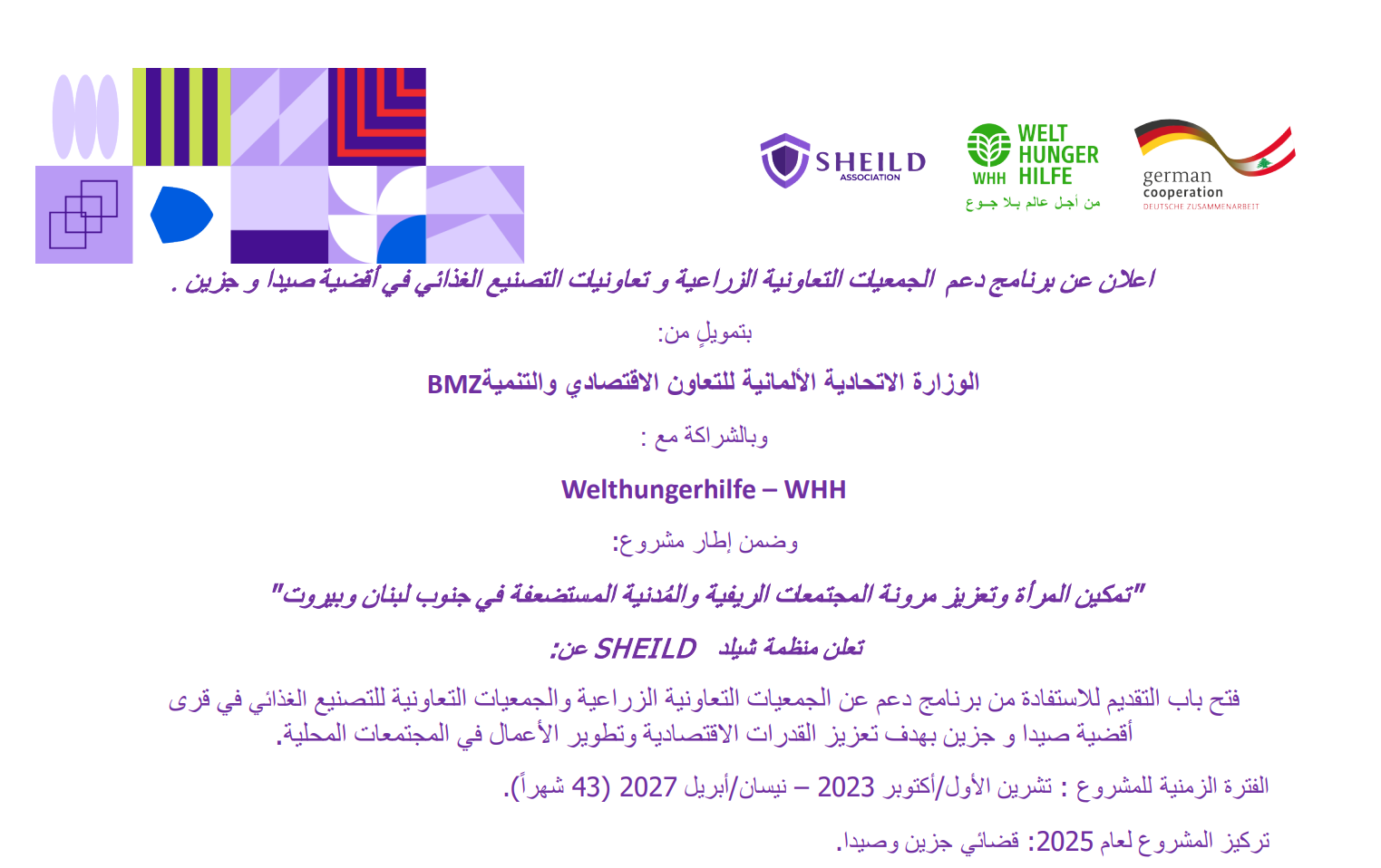 بتمویل من الوزارة الاتحادیة الألمانیة للتعاون الاقتصادي والتنمیةBMZ وبالشراكة معWHH – Welthungerhilfe ، تعلن منظمة شيلد Sheild عن فتح باب التقدیم للاستفادة من برنامج دعم عن الجمعیات التعاونیة الزراعیة والجمعیات التعاونیة للتصنیع الغذائي في
